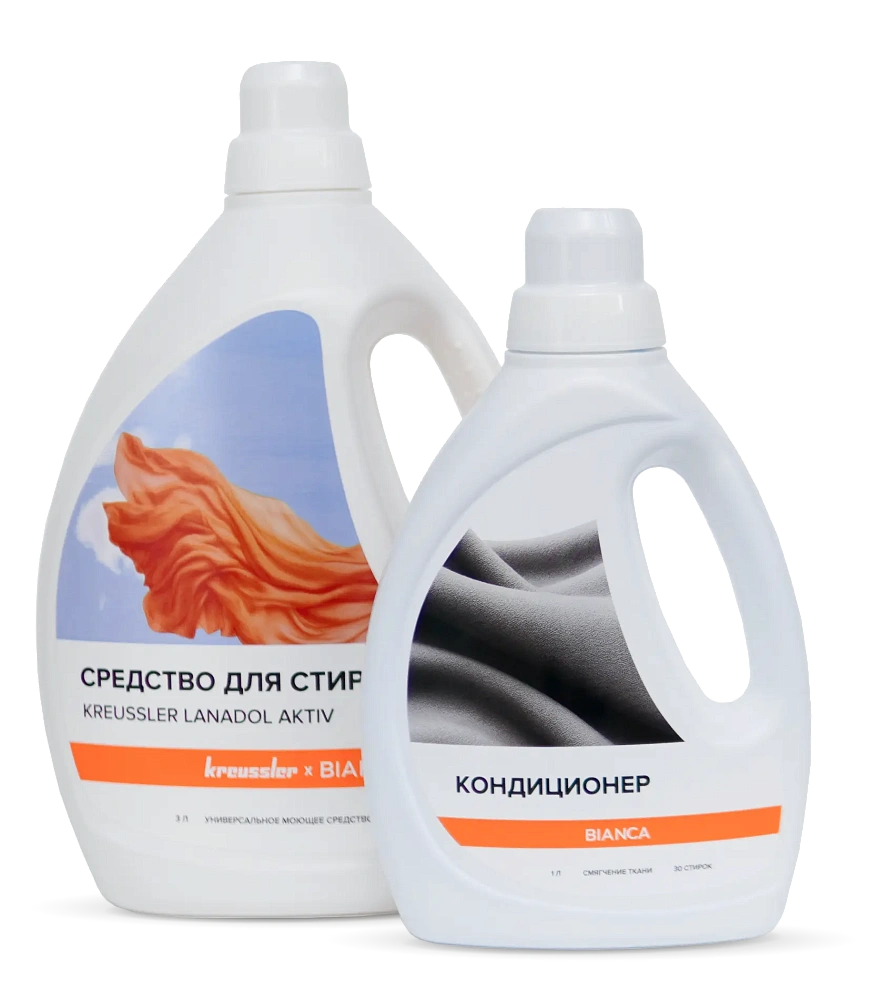 Средство для стирки изготовлено совместно с брендом Kreussler. А кондиционер для белья с нейтральным запахом изготовлен самостоятельно.